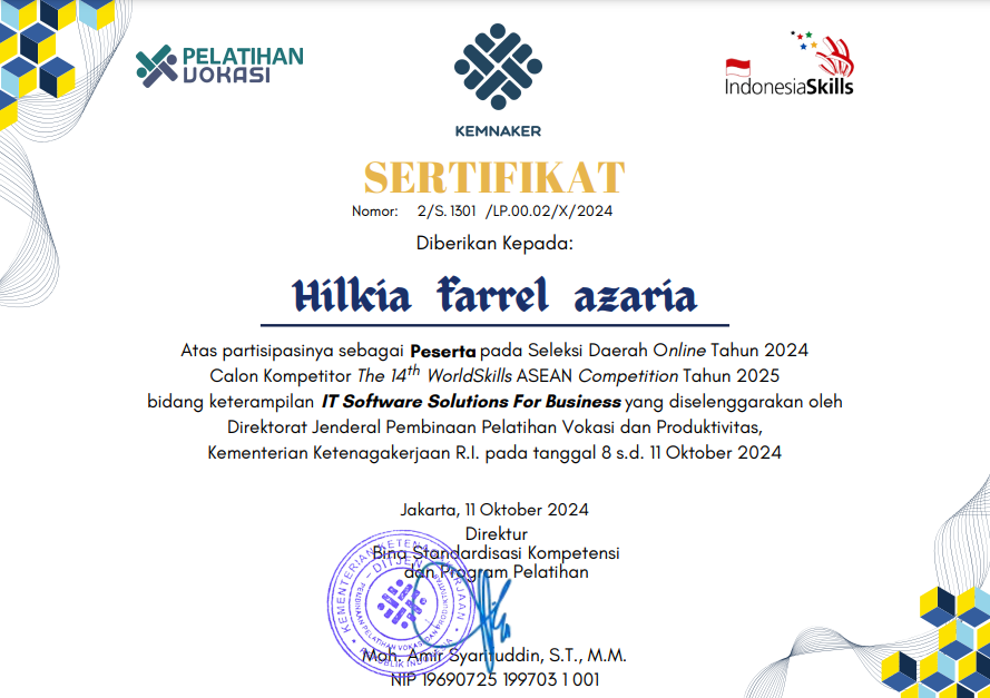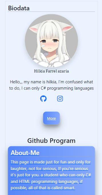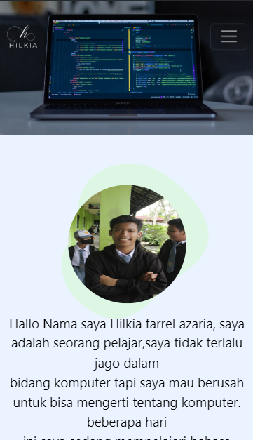 hello my name is hilkia. I was born on August 14, 2007 I went to SMK 1 Sampit I am currently learning the Javascript and C# programming languages.